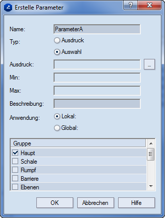 Auswahl Legt den neuen Parameter als Auswahl Parameter fest.