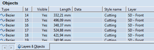 When you have finished drawing a Bézier curve, its object type, Id number, length and style are recorded in the Objects tab in the tabular area.