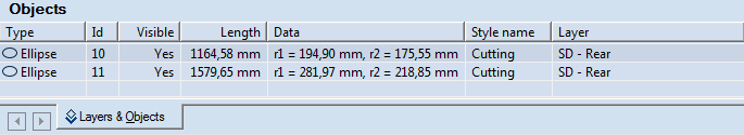 When you have finished drawing an ellipse, its object type, Id number, circumference length, radii and style are recorded in the Objects tab in the tabular area.