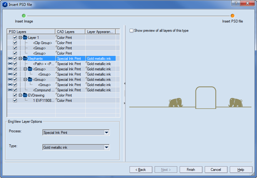 Layer Appearance The process variety that is assigned to the objects in the layer. Once the files is imported, this is the process that will appear, in the tabular area, in the Type column of the Layers section of the Layers & Objects tab.