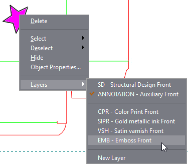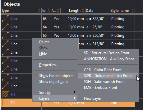 IMPORTANT: Due to technological purposes, objects in the styles related to the diecutting process (Cutting, Creasing, Perforating, Cut-creasing) as well as the objects defined in the styles Dieboard and Sheet cannot be assigned to surface process layers. For example, if you select a dust flap and begin assigning it to the Color print layer, Prinect will stop the operation, because the dust flap's structure has objects in the Cutting and Creasing, which cannot be subjected to color printing. However, if in the same dust flap a color printing job has to be done on an image that covers the dust flap's entire area, the image, and not the dust flap, needs to be selected and assigned to the Color print process layer.