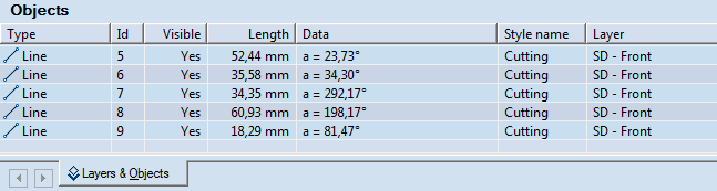 When you have finished drawing a regular line, its object type, Id number, length, angle and style appear in the Objects tab in the tabular area.