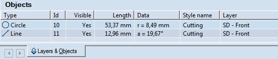 When you have finished drawing a connected tangent line, its object type, Id number, length, angle and style appear in the Objects tab in the tabular area.