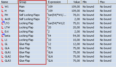 You can group parameters according to a common characteristic. By using parameter groups the orientation in the table becomes easier, and you can hide and show whole groups of parameters depending on whether or not you need to see them. Parameters groups are displayed in the Group column of the Parameters tab. You can hide or show whole groups of parameters.