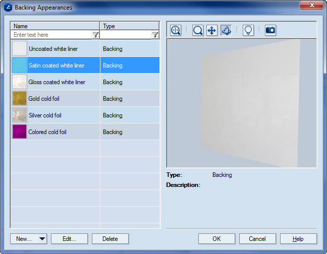 | Edit | Opens a dialog box in which you can edit the colors, texture, bump, and Physically Based Rendering (PBR) of a selected backing appearance. | |