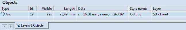 type, Id number, circumferential length, radius, angle (sweep) and style