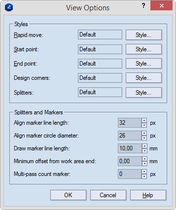 Splitters Displays the style that is used for displaying the splitters necessary for the CAM tool to correctly continue operating along the tool path.
