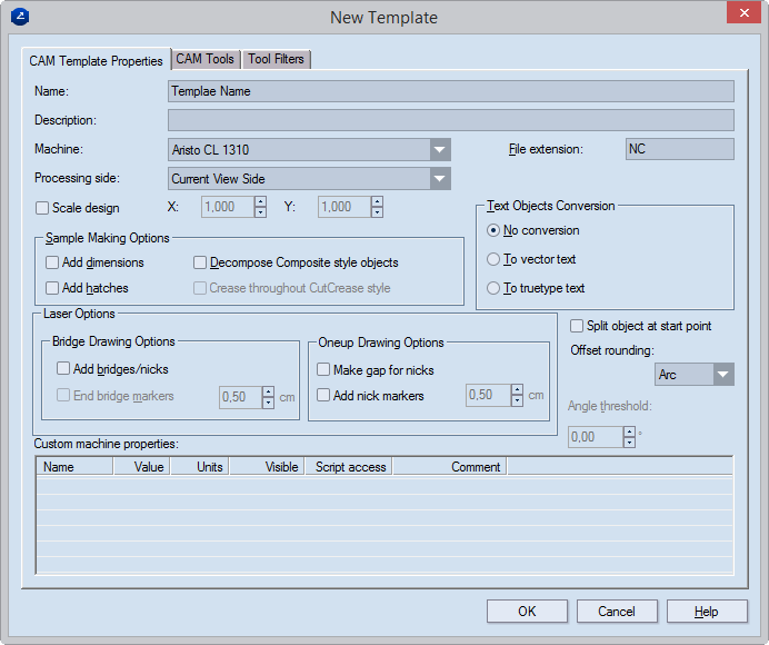 Machine Assigns a CAM machine to be used in the template. The list displays only the CAM machines which have the property 'Enabled' selected in the CAM Machines tab in the CAM Options dialog box. All CAM tools inherit the custom properties set for the CAM machine used in the CAM template.