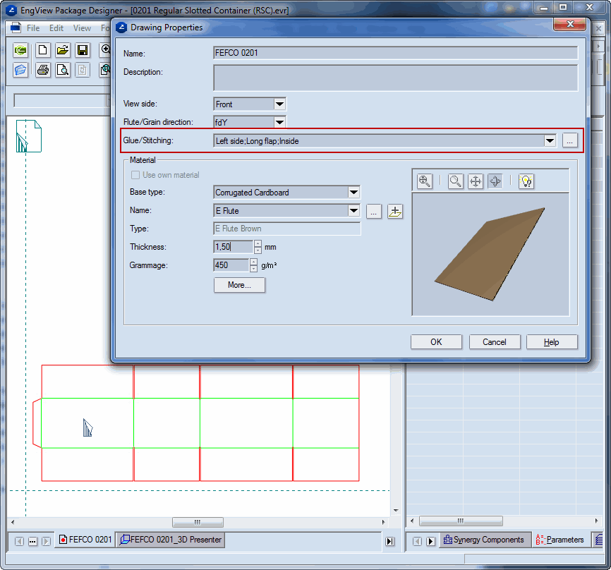 NOTE: For the purposes of the following example about how to set the side of the glue flap, the design FEFCO 0201 Regular Slotted Container (RSC).evr is used.