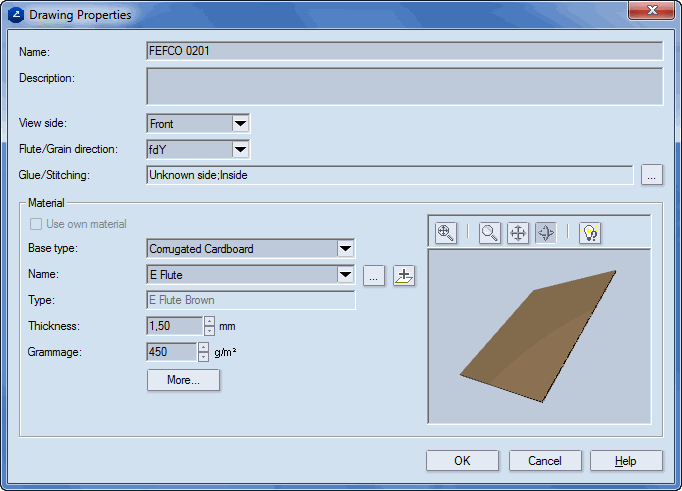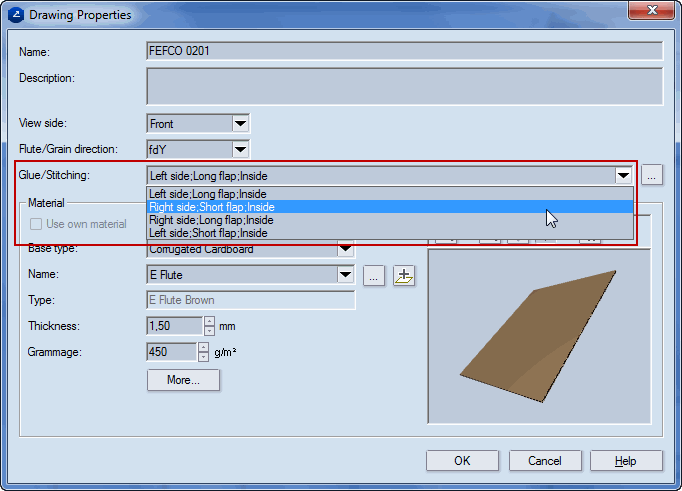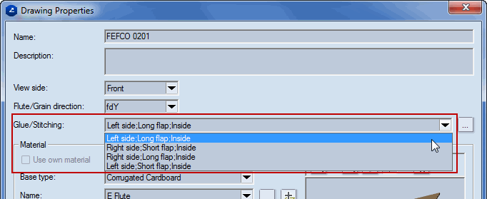 Note that in the Drawing Properties dialog the Glue/stitching drop-down list is now available and offers a list of glue flap positioning choices.