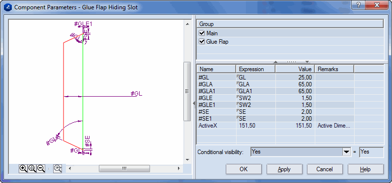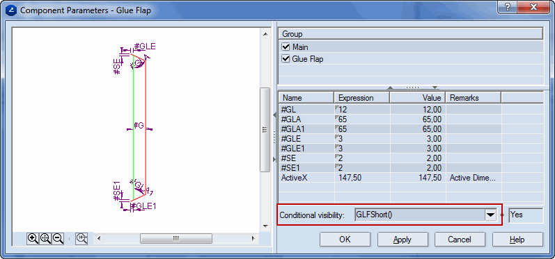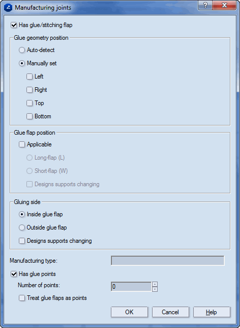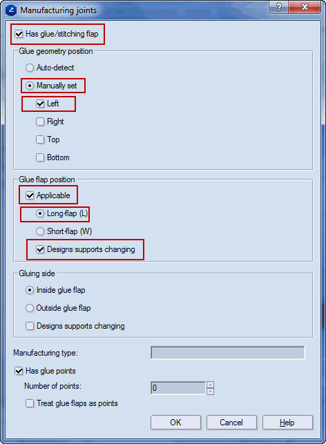 NOTE: The functions GLFLong() and GLFShort() cause the glue flaps to be visible or invisible, taking into account the settings in the glue flap position area in the Manufacturing joints dialog — see Step 4.