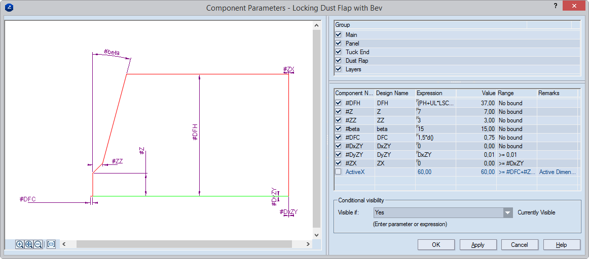 The table — For guidance as to how parameters affect the structure of the component, clicking a parameter row animates, in the preview area, the object that the parameter controls.