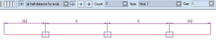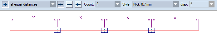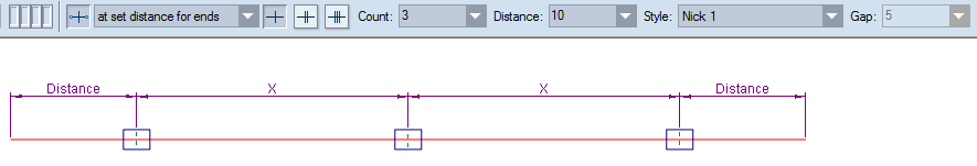 Two nicks are placed at distances from the ends that you set (Distance). What remains of the object's length is then divided into equal distances. Three nicks placed in the following image.