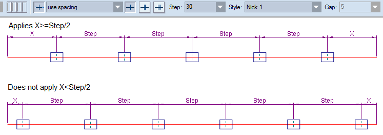 You set a step (Step) at which the program places the nicks from each other. What remains of the object's length is then divided into two so that the two ends's distances are equal to or greater than the half of the set step. In the image below, the upper placement solution will be applied. Five nicks are placed.