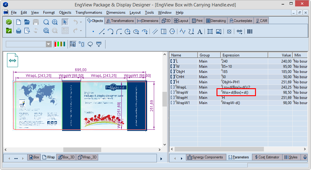 IMPORTANT: Note that the parameter WrapW is a local parameter. This means that d() will extract the material thickness of the current drawing (folding carton, 0.5 mm). This thickness differs from the one set for the project (1.5 mm). To calculate the WrapW value, we need to take into account the material thickness of the Box drawing (it is not the current one). That is why we need to specify, in the brackets, the name of the other drawing.