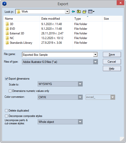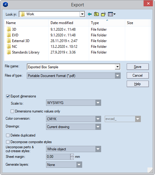 IMPORTANT FOR EXPORTING LAYOUT DRAWINGS: When the check box is selected, all layout 1ups (parts) are converted into separate objects. In the exported file, (1) no layer groups are formed for the layout 1ups (parts) and (2) in each case of overlapping objects, the objects are merged into a single object. USAGE NOTE: Using this file conversion functionality comes in especially handy when exporting Prinect data to certain programs — for example, Zund Cut Center.