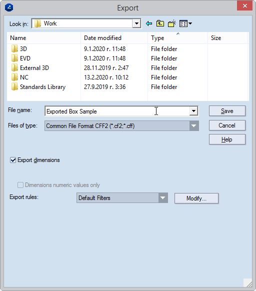 Depending on the selected file format, the dialog box displays the export rules for the selected file format. For details about the export settings for each file format, click the links that follow: