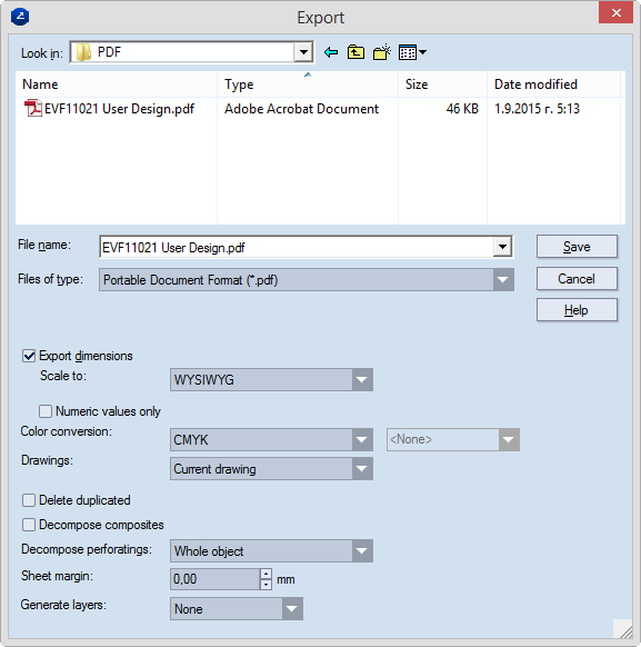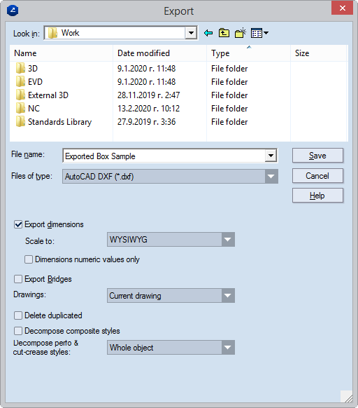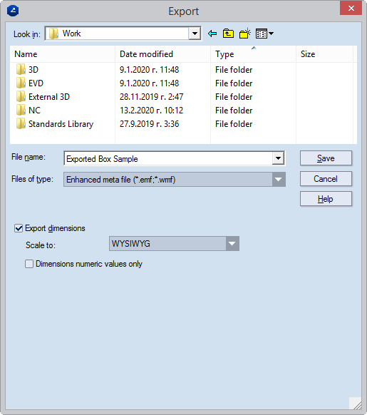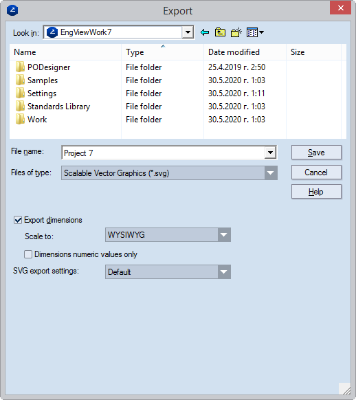 Export dimensions When the check box is selected, custom settings can be made to how dimension lines are exported. Normally how dimension lines are exported is set in the drawing's own properties. If a project contains at least one drawing that has no preset dimensions scaling factor, the Scale to list becomes available, in which a scaling option can be set for the dimension lines in the entire project.