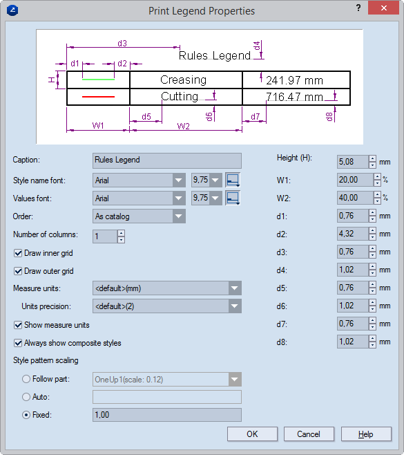 Follow part In the legend, the program scales the style pattern by a scale factor that is identical to that applied to the part (1up or layout) selected from the drop-down list. Normally, when setting a scale factor, from the drop-down list select the 1up or layout to which the current legend refers.