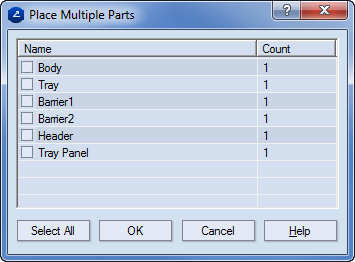 NOTE: In each instance of inserting multiple parts, the selected parts are inserted in a single row, first starting from the origin of the coordinate system. Each repetition of Step 8 will result in placing the parts in a row above the last one.