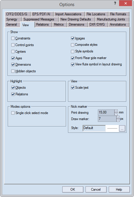 Show Sets the attributes that will appear on the screen. NOTE: Apart from the commands Dimensions and View flute symbols in layout drawings, the commands in the Show section produce identical effects as the commands that you find when you double-click in the graphical area, and then point to Show.