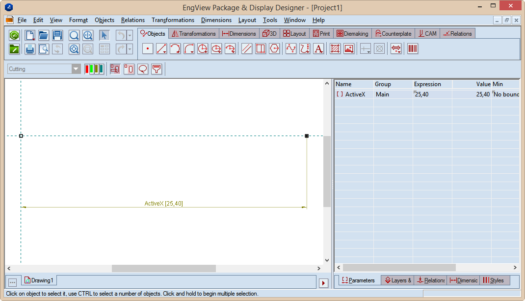 A single component has two active control points: the first is located at the origin of the coordinate system; the second is on the x-axis at a default distance of 1 inch (25.40 mm) to the right from the first. The two active points are dimensioned by an active system dimension parameterized by the parameter ActiveX. You can change the distance between the active points by changing the value of the ActiveX parameter.