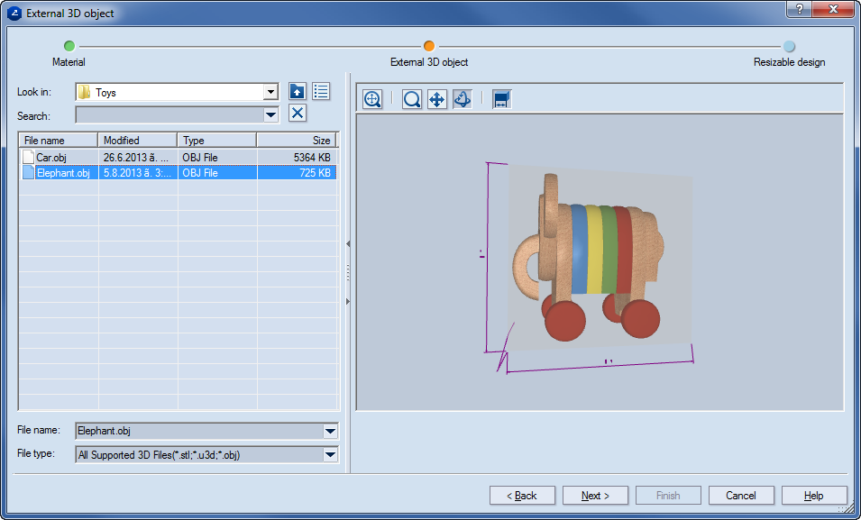 The wizard opens the External 3D Object step. In it, you select the external object that you want to use.