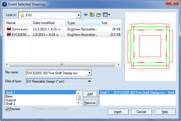 - Select the .evr, .evd or .evf file that you want to insert. Note that the names of the 1up and layout drawings appear in the lower left section of the dialog box.