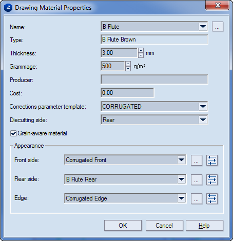 Flute/grain direction Sets the direction — along the x- or the y-axis — of the flute (or grain) of the material.