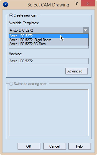 Switch to Existing CAM Use this option to switch to an existing CAM drawing created from the active source drawing (1up, layout or counterplate). This lets you choose not to create multiple identical CAM drawings from the same source drawing. NOTE: The list displays the names of existing CAM drawings created from the active 1up, layout or counterplate drawing.