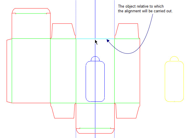 As the reference object is pointed to, three vertical lines appear, representing the aligning possibilities — on the object's leftmost point, on its middle, and on the rightmost point.