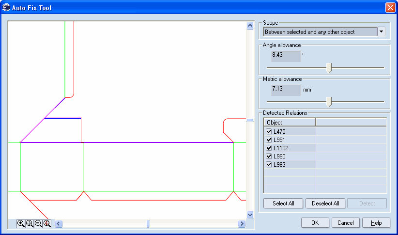 Angle allowance Sets the error allowance for angles. This is the permitted deviation (error) in the angle two objects. The value may be compensated by a segment and a joining relation is added so that the two objects become joined. You can use either the box or the slider to set the allowance. The bigger the allowance, the greater angle between objects will be detected.