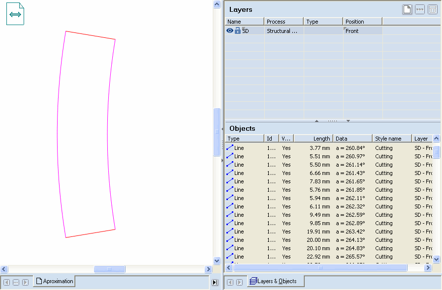 To solve this problem reliably and speedily, you can integrate the multiple objects into one object or a series of larger objects. The length of the resultant object is the result of the approximation of the combined lengths of the original objects. Depending on the approximation settings, Prinect approximates the original objects into curves or lines — either in a single object or as a series of connected larger objects.