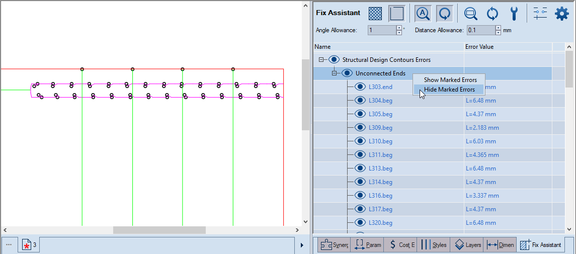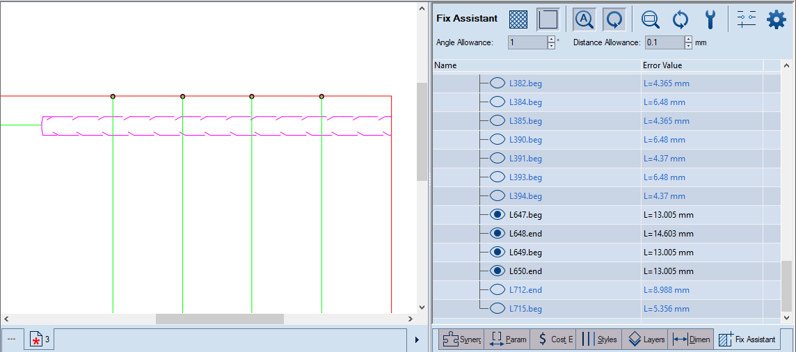 The Fix Assistant tool inspects geometric elements, detecting errors according to criteria that you set — angle and distance allowances, minimum areas and object size, crease line limits. After a file is imported and criteria are set, Fix Assistant uses them to produce a list of drafting errors. Then you decide which errors are critical and need to be fixed and which can stay as they are.