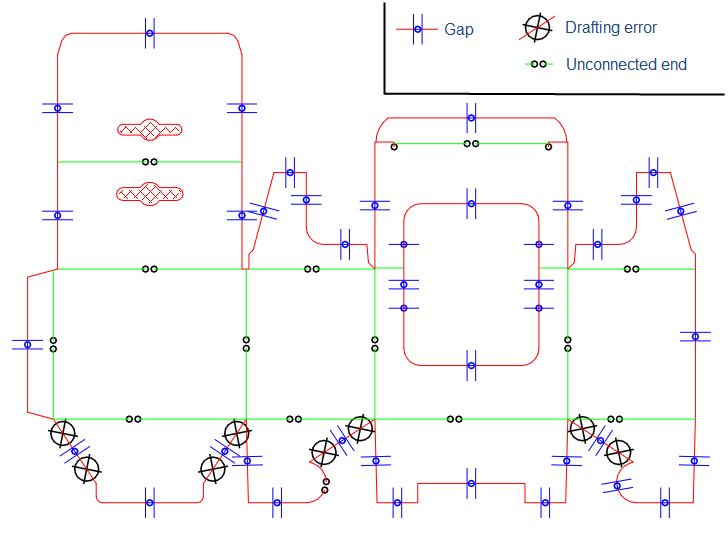.In the graphical area the closed contours are indicated by colored hatches. The drafting errors that fall within the values set by default are indicated by crossed circles.