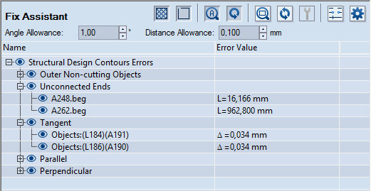 In the tabular area, the Fix Assistant tab appears, in which the detected errors are listed in groups by technical features.