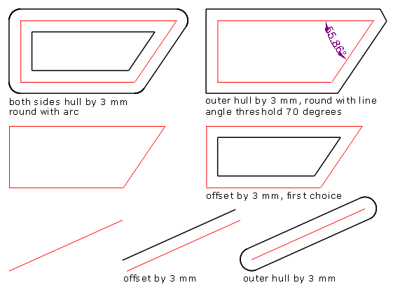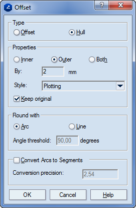 Round with Specifies how offset and outer hull angles will be rounded. When you are drawing an offset to the outer side of an angle or an outer hull to objects that form an angle, the resulting angle in the offset/hull object must be rounded so that the vertex of the original angle is at the same distance from all the points that belong to the rounded angle (when rounded with an arc), or from the angle-clipping line segment, respectively.