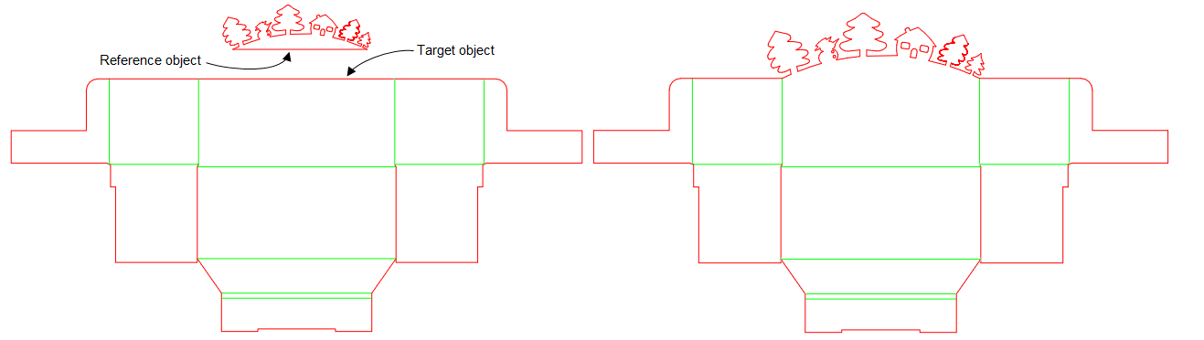 Select Distance (Available when a target object is selected in the modes translations, scaling, mirroring and rotating) Starts the mode for selecting the object whose distance will serve as reference in the transformation modes translation, scaling, mirroring and rotating. For an example of how to use this functionality, see Example 2 below.