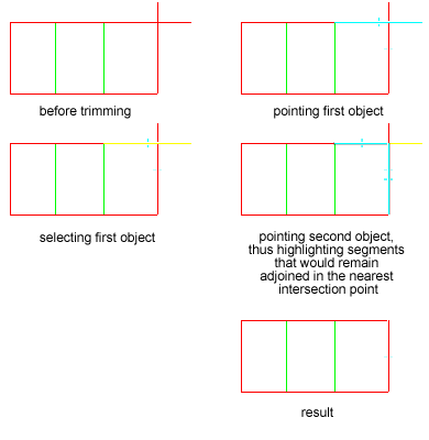Trimming or extending objects to a cross point results in the trimming, respectively, extending an object to the point at which it, or its projection, intersects with another object.