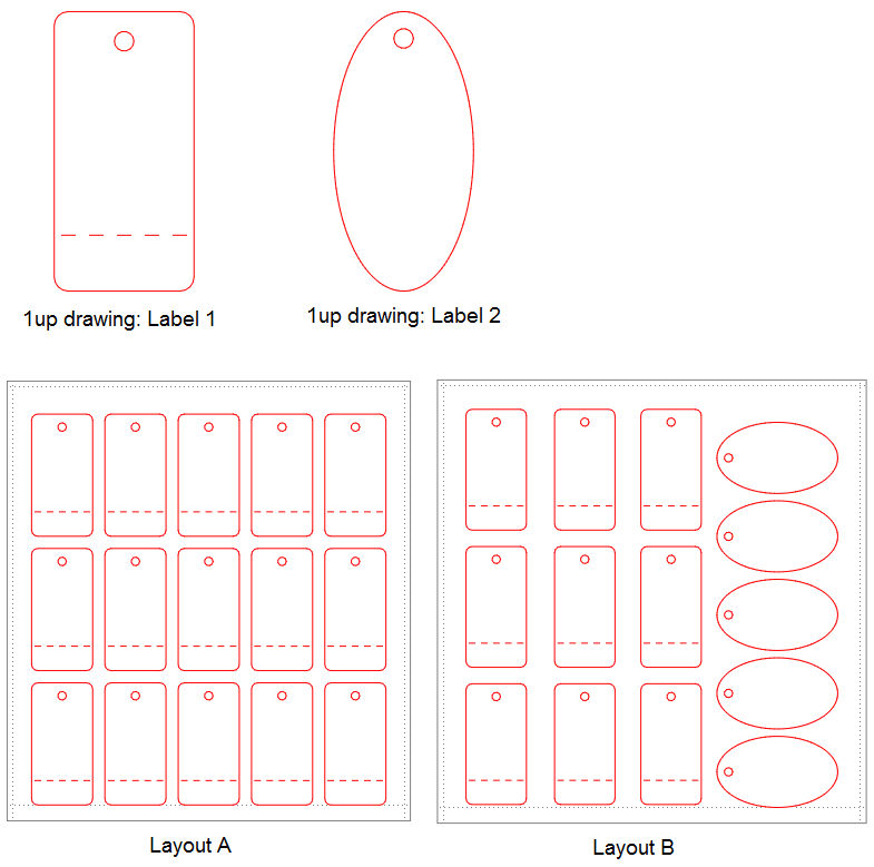 Two 1ups are arrayed in two layouts. In the first example, the 1ups are named Label 1 and Label 2; in the second, they are named Rectangle and Ellipse. In both examples, the layouts names are identical: Layout A and Layout B.