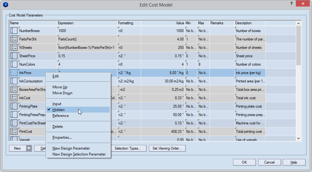 You can choose not to see certain parameters while you are working with a cost model. You do this by setting these parameters to Hidden while editing the cost model.