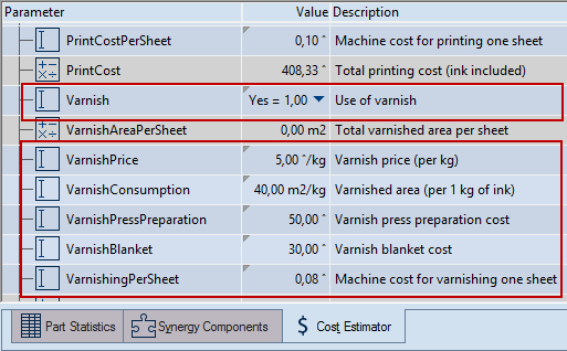 - Design selection parameters. These contain only predefined values. While using the cost model, you can choose between the various predefined values.