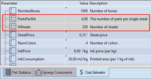 - Design parameters. These are parameters whose values can be edited directly in the tabular area. Editing the value of a design parameter in the tabular area does not change the predefined value in the cost model.