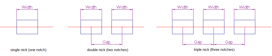 Single nicks come in three types: with one, two or three notches. Note that placing of double and triple nicks uses gap, which is the distance between the two, respectively, three notches forming the nick. The gap is the distance between notches' middles.
