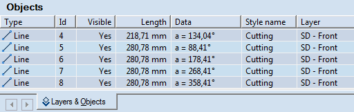 When you have finished drawing a regular polygon, its object types, Ids, lengths, angles against the x-axis and the styles of each side of the polygon are recorded as regular lines in the Objects tab in the tabular area.