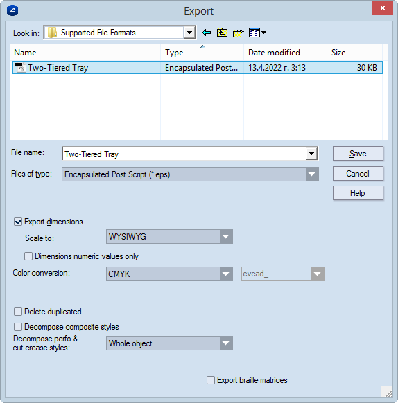 IMPORTANT FOR EXPORTING LAYOUT DRAWINGS: When the check box is selected, all layout 1ups (parts) are converted into separate objects. In the exported file, (1) no layer groups are formed for the layout 1ups (parts) and (2) in each case of overlapping objects, the objects are merged into a single object. USAGE NOTE: Using this file conversion functionality comes in especially handy when exporting EngView data to certain programs — for example, Zund Cut Center.
