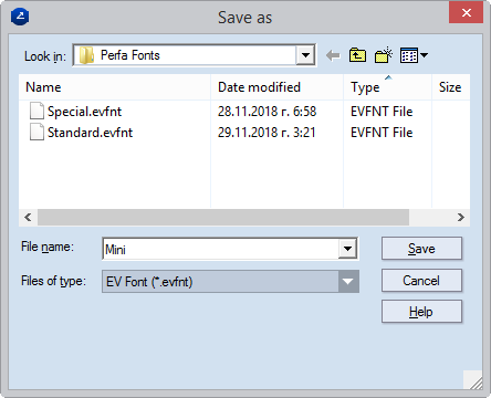 The Save As dialog box appears opening the Perfa Fonts directory.