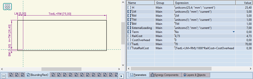 TotalRailCost The total cost of the guide-rail. You can edit the parameter formula as your case requires. The parameter plays a role in the calculation of the perfa text's price.