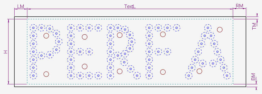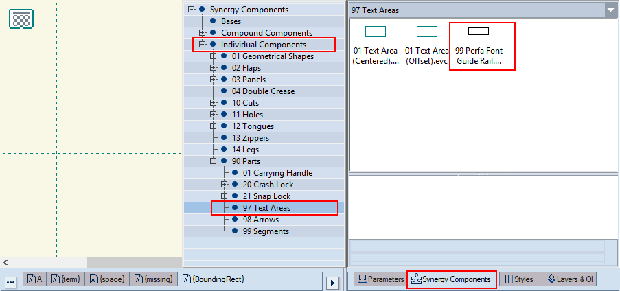 If, when using the perfa font, you want to visualize the size of the guide-rail that holds the text, in the {BoundingRect} drawing drag the base component 99 Perfa Font Guide Rail.evb. It will resize automatically around the perfa text. Find the component in Individual Components\90 Parts\97 Text Areas (pictured).