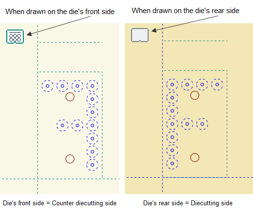 IMPORTANT: Pay attention to the side of the drawing on which you are creating the symbol — the dieboard's front or rear side. See the image below for guidance of how drawing sides affect symbols' orientations.